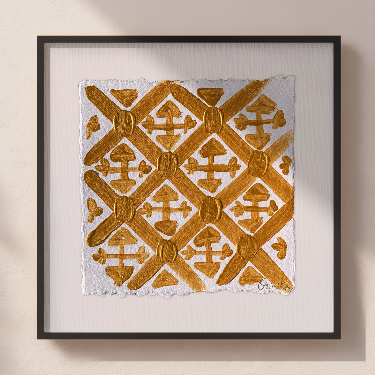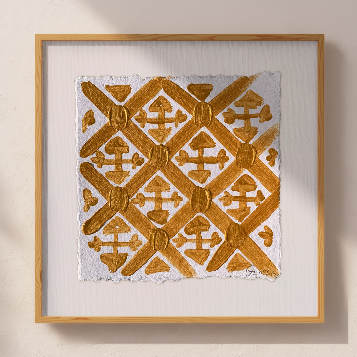 Geometric precision meets symbolic depth in this golden composition. Inspired by protective signs in Ukrainian embroidery, the pattern suggests strength, clarity, and sacred order. Each form glows with intention — a visual echo of ancestral wisdom, reimagined in modern gold.