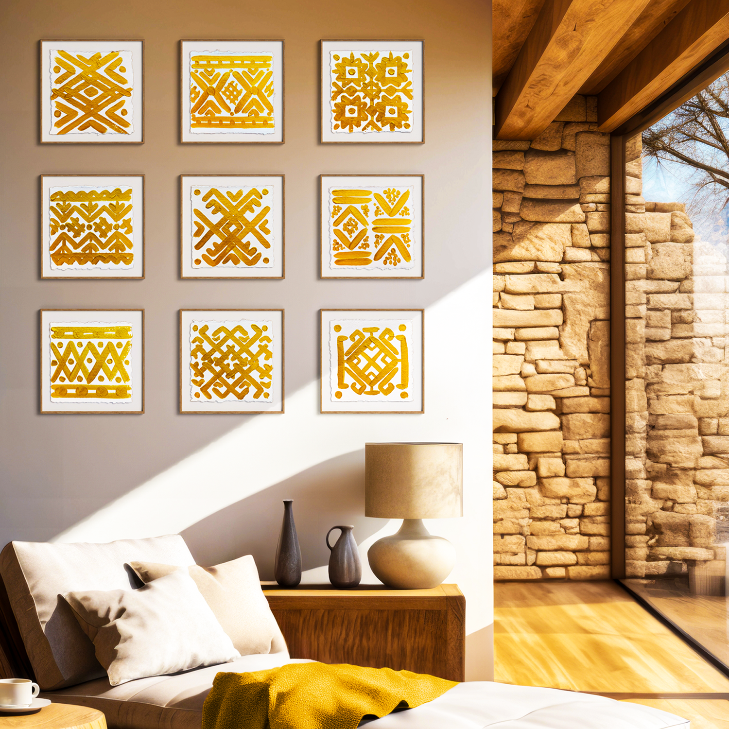 A golden rhythm pulses through this composition — rows of circles and diamonds echo ceremonial bands in Ukrainian embroidery. The repetition suggests continuity, community, and celebration. It’s a dance of symbols, grounded in tradition and glowing with festive energy.