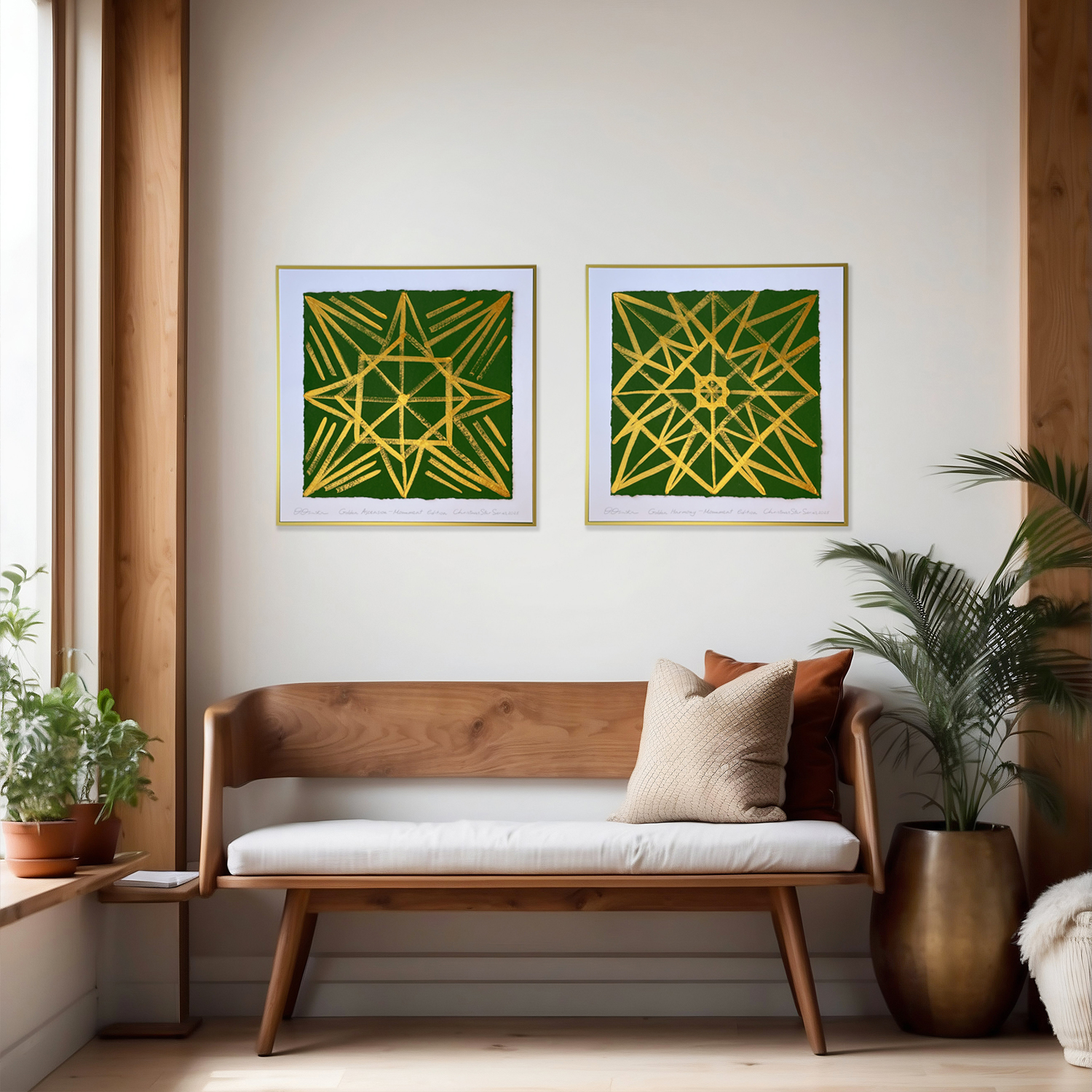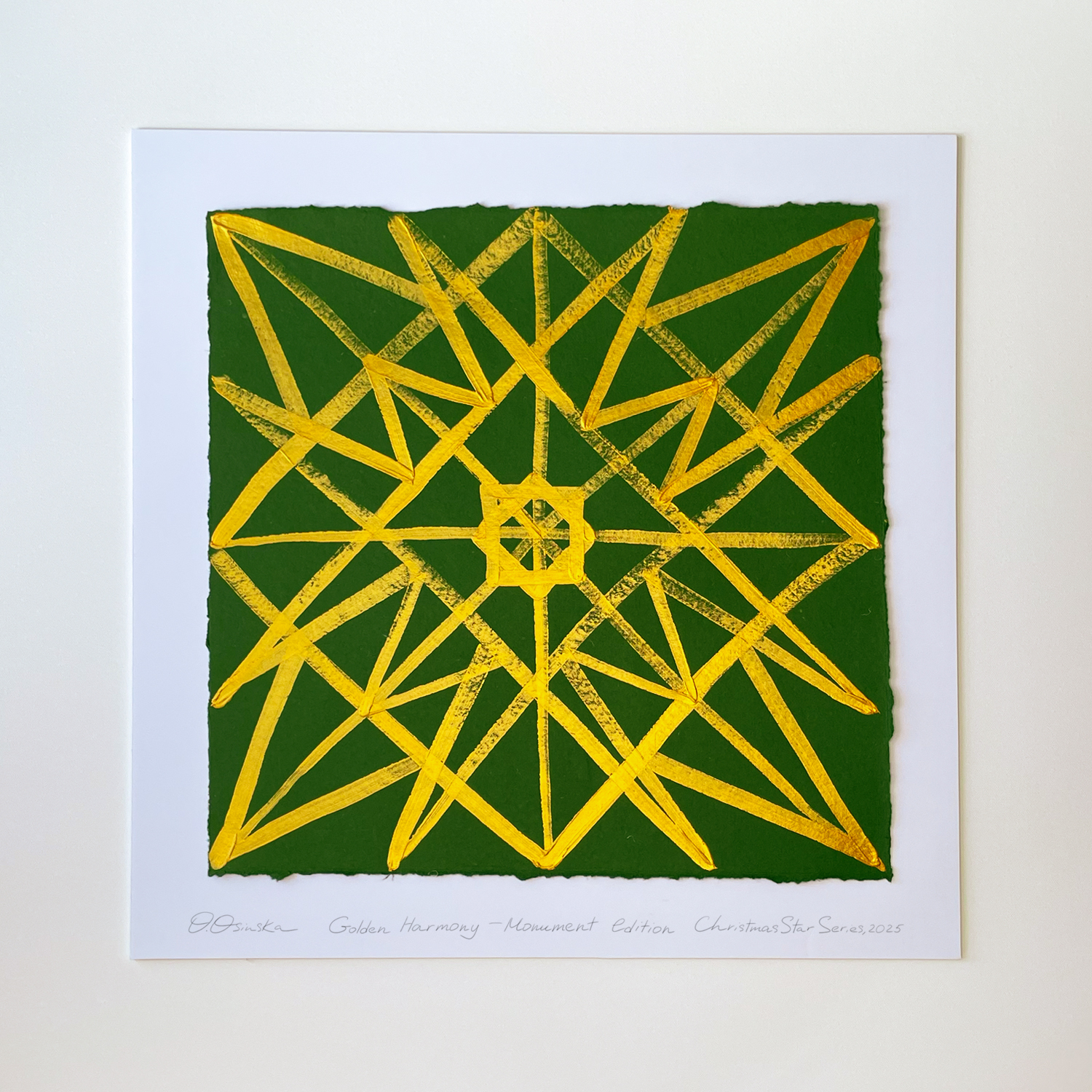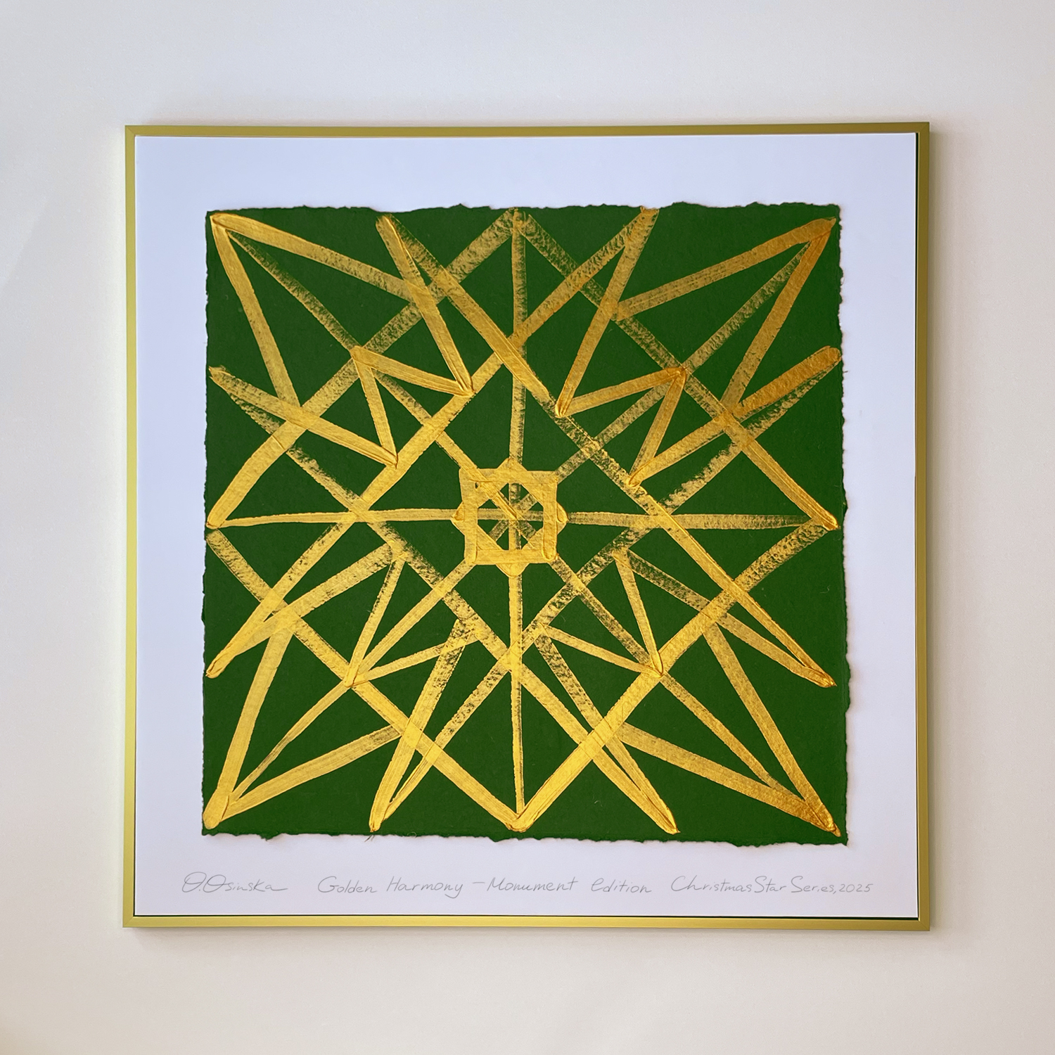 is a contemporary interpretation of the ancient Ukrainian Christmas Star symbol, painted in luminous gold on deep green handmade paper. Its intersecting geometric lines echo the protective energy and sacred rhythm found in traditional Ukrainian embroidery. This Monument Edition features an expanded, more powerful composition that emphasizes symmetry, structure, and visual weight—creating a striking, elevated presence in any modern interior. This artwork radiates balance, light, and festive strength—bringing a refined cultural statement into any living space.