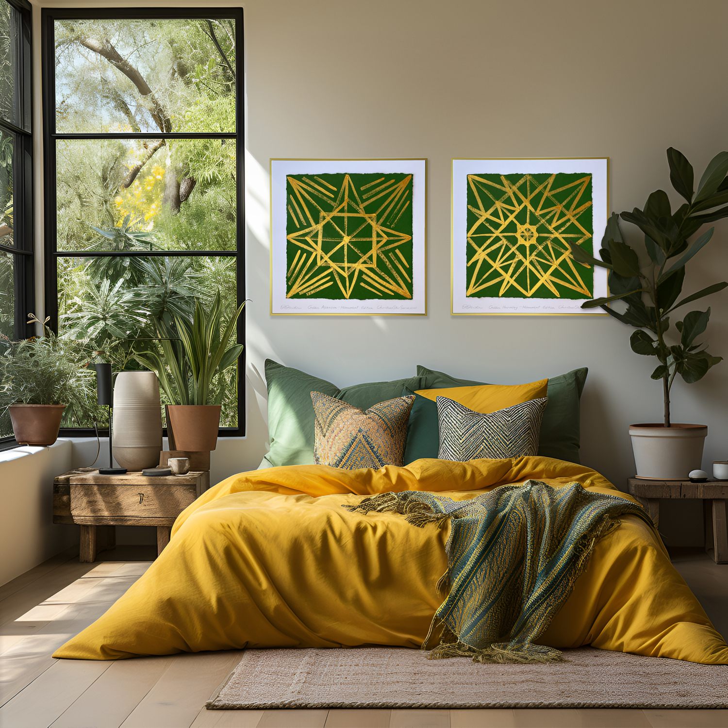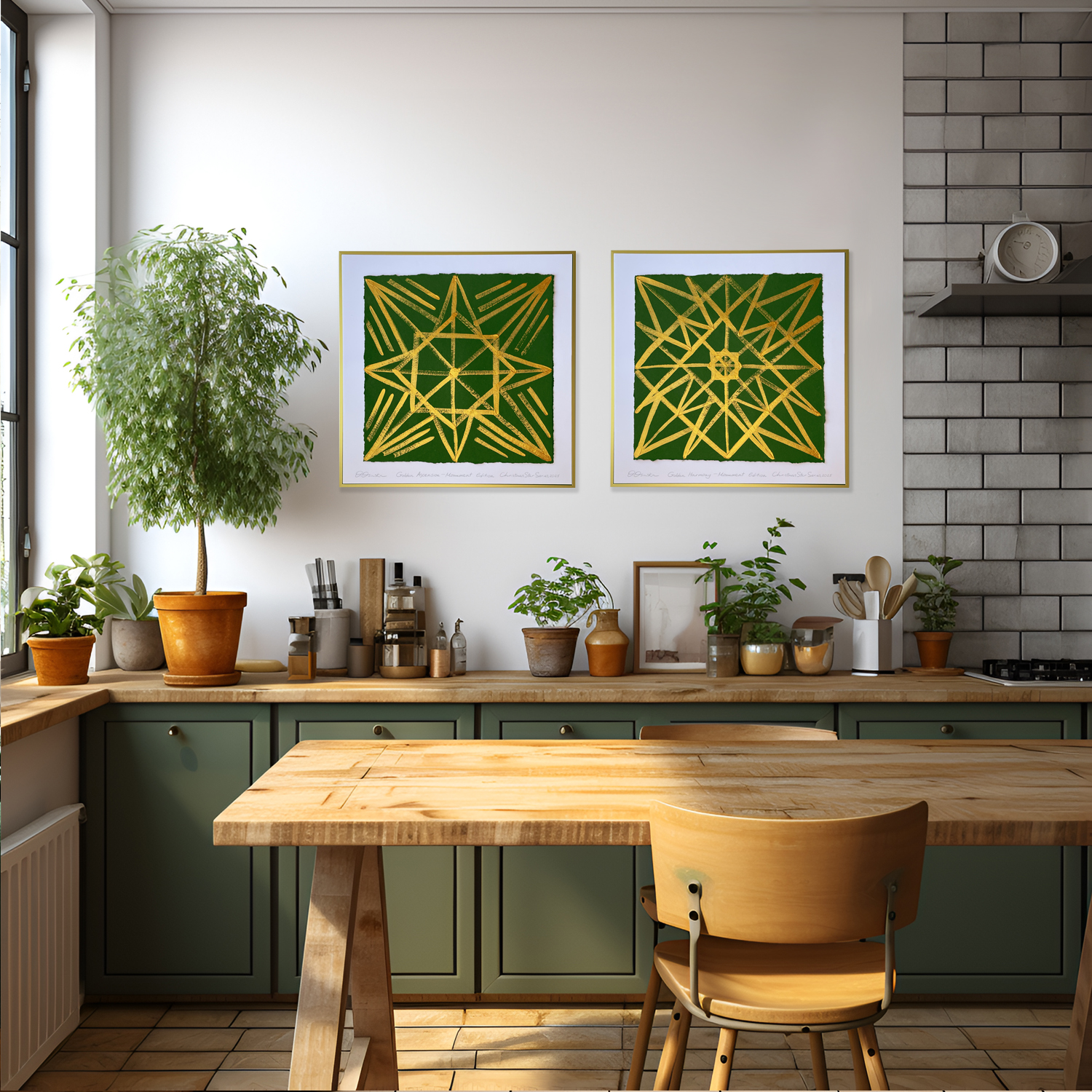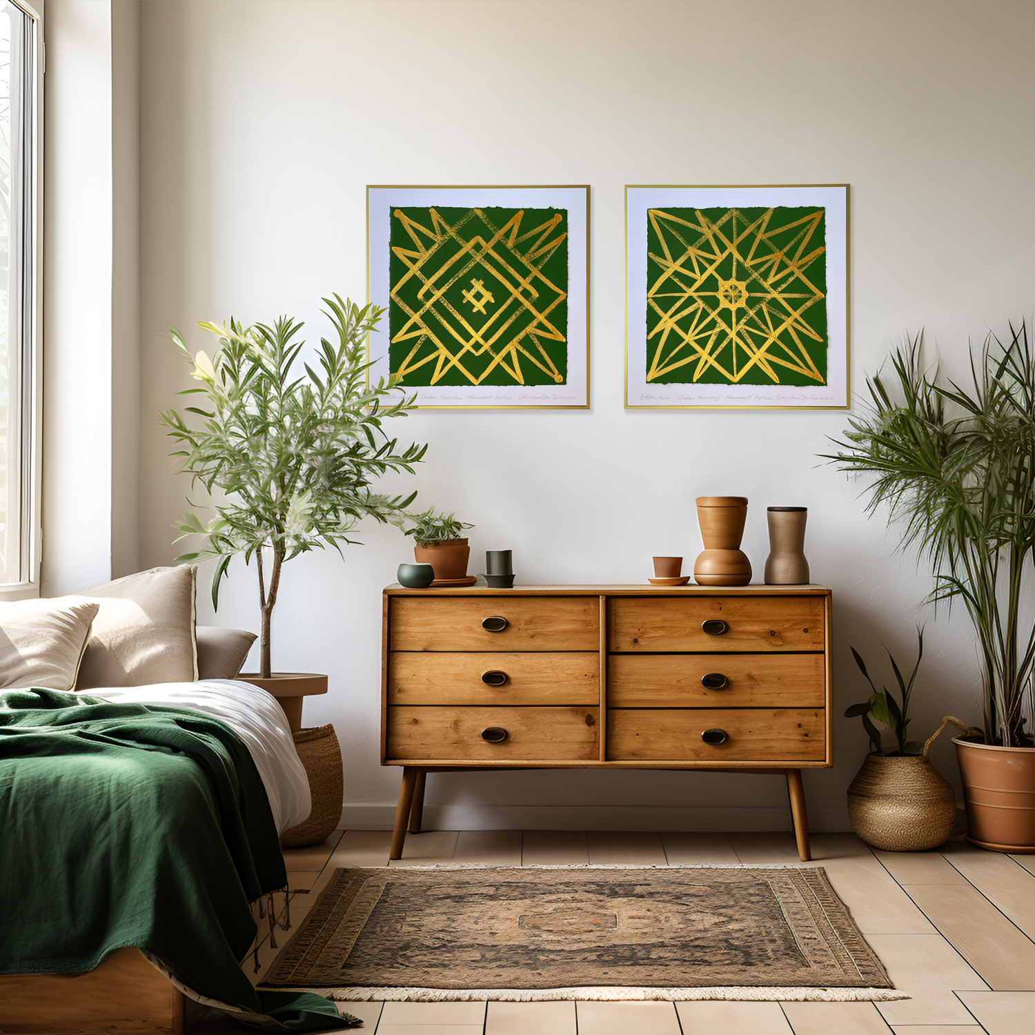 is a contemporary interpretation of the ancient Ukrainian Christmas Star symbol, painted in luminous gold on deep green handmade paper. Its intersecting geometric lines echo the protective energy and sacred rhythm found in traditional Ukrainian embroidery. This Monument Edition features an expanded, more powerful composition that emphasizes symmetry, structure, and visual weight—creating a striking, elevated presence in any modern interior. This artwork radiates balance, light, and festive strength—bringing a refined cultural statement into any living space.