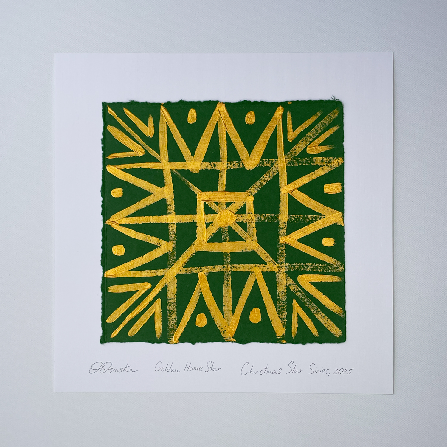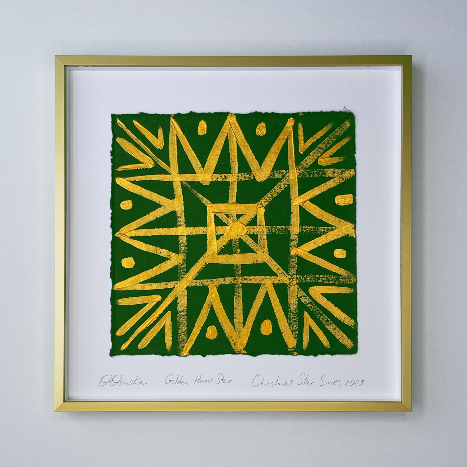 is a contemporary interpretation of the ancient Ukrainian Christmas Star symbol, painted in luminous gold on deep green handmade paper. Its intersecting geometric lines echo the protective energy and sacred rhythm found in traditional Ukrainian embroidery. This artwork radiates balance, light, and festive strength—bringing a refined cultural statement into any modern interior.