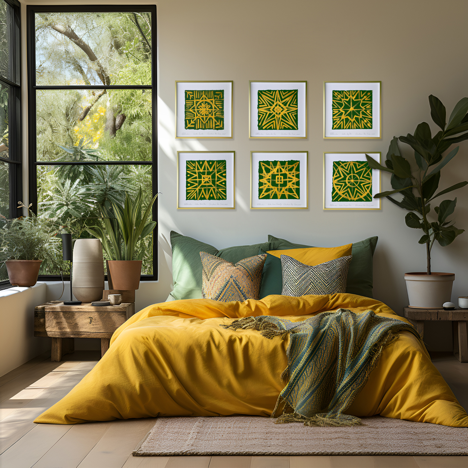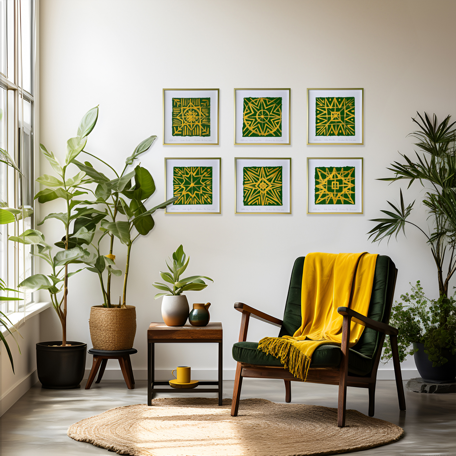 is a contemporary interpretation of the ancient Ukrainian Christmas Star symbol, painted in luminous gold on deep green handmade paper. Its intersecting geometric lines echo the protective energy and sacred rhythm found in traditional Ukrainian embroidery. This artwork radiates balance, light, and festive strength—bringing a refined cultural statement into any modern interior.