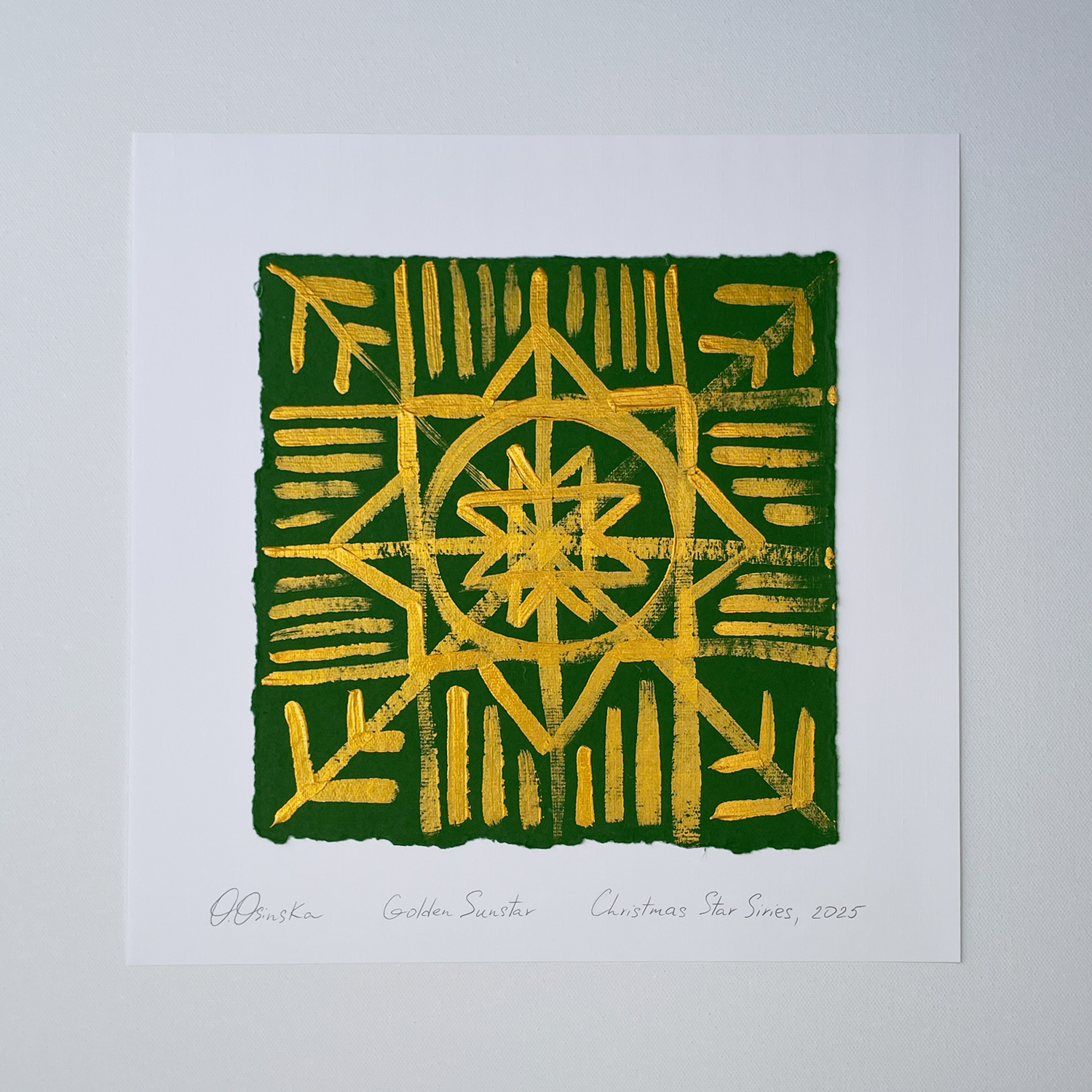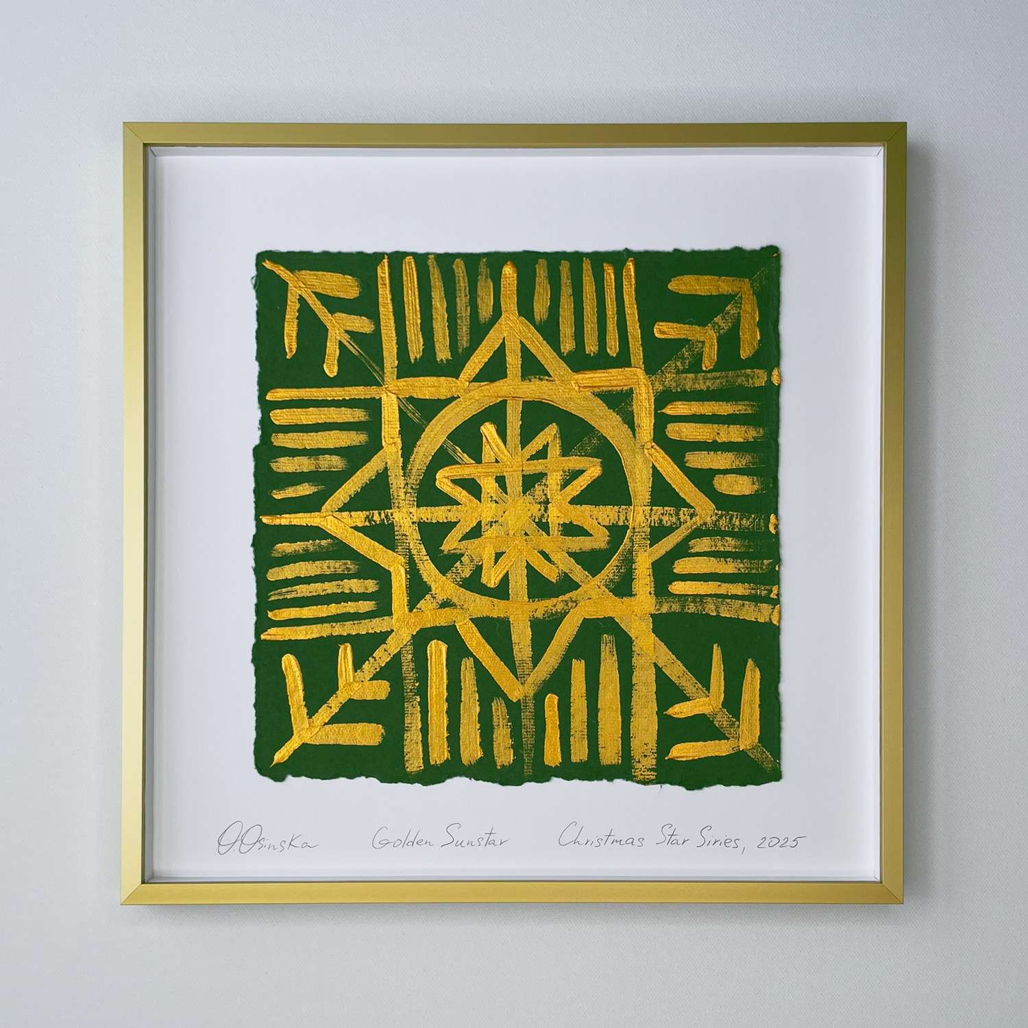 is a contemporary interpretation of the ancient Ukrainian Christmas Star symbol, painted in luminous gold on deep green handmade paper. Its intersecting geometric lines echo the protective energy and sacred rhythm found in traditional Ukrainian embroidery. This artwork radiates balance, light, and festive strength—bringing a refined cultural statement into any modern interior.