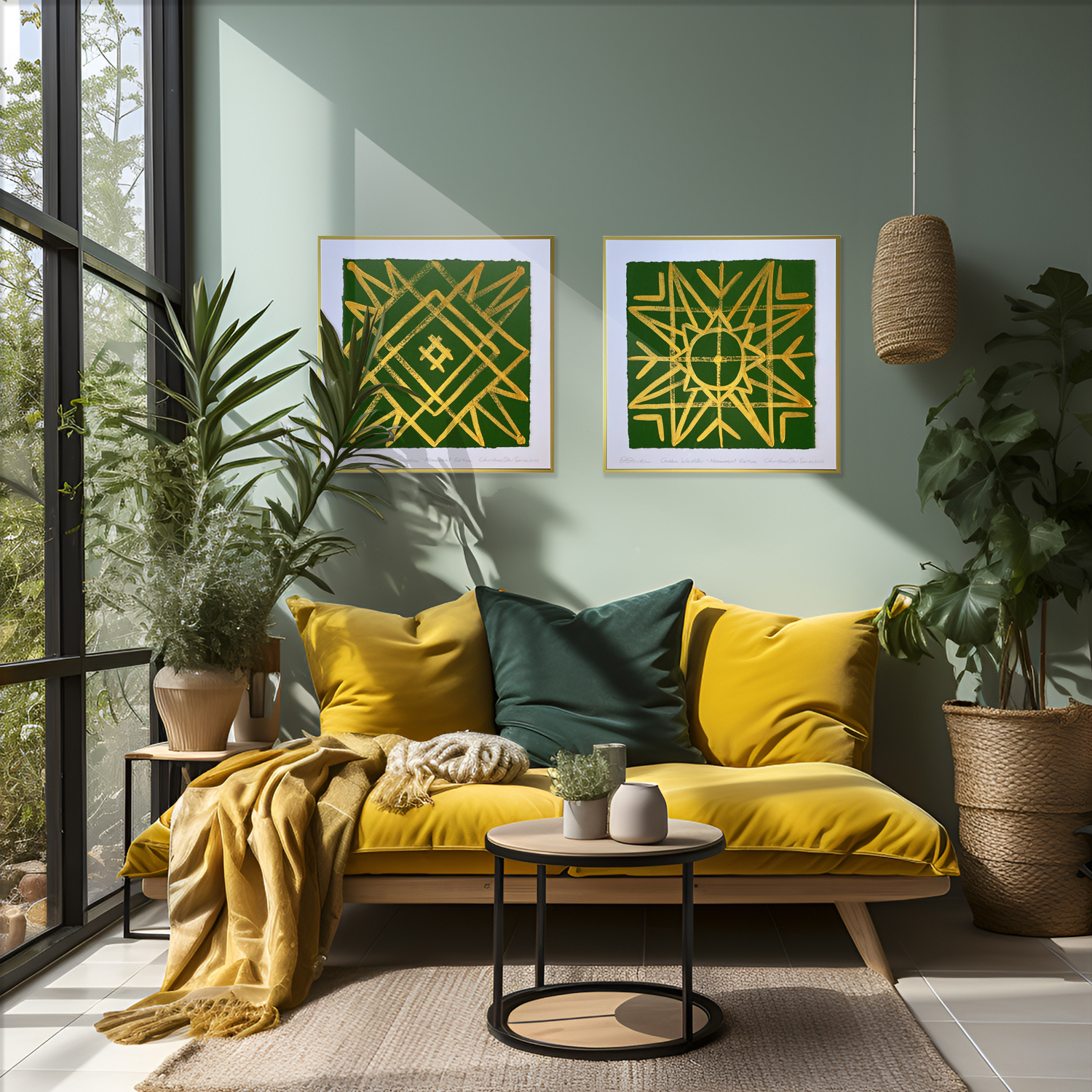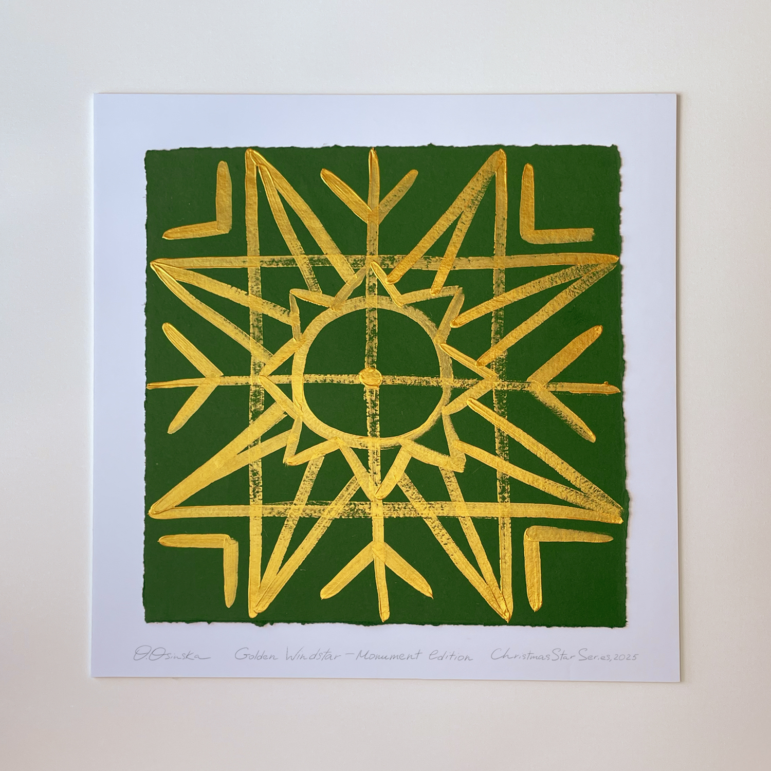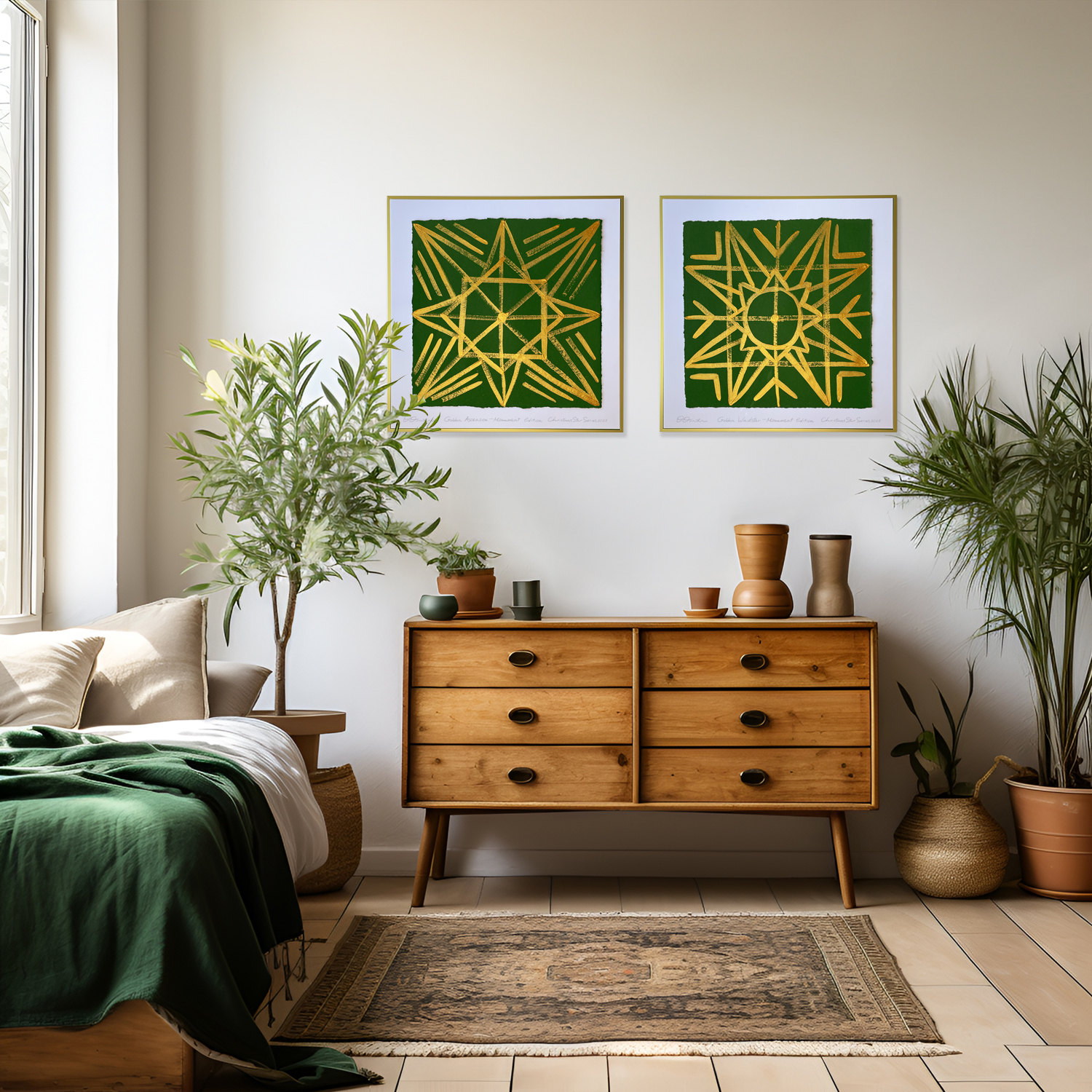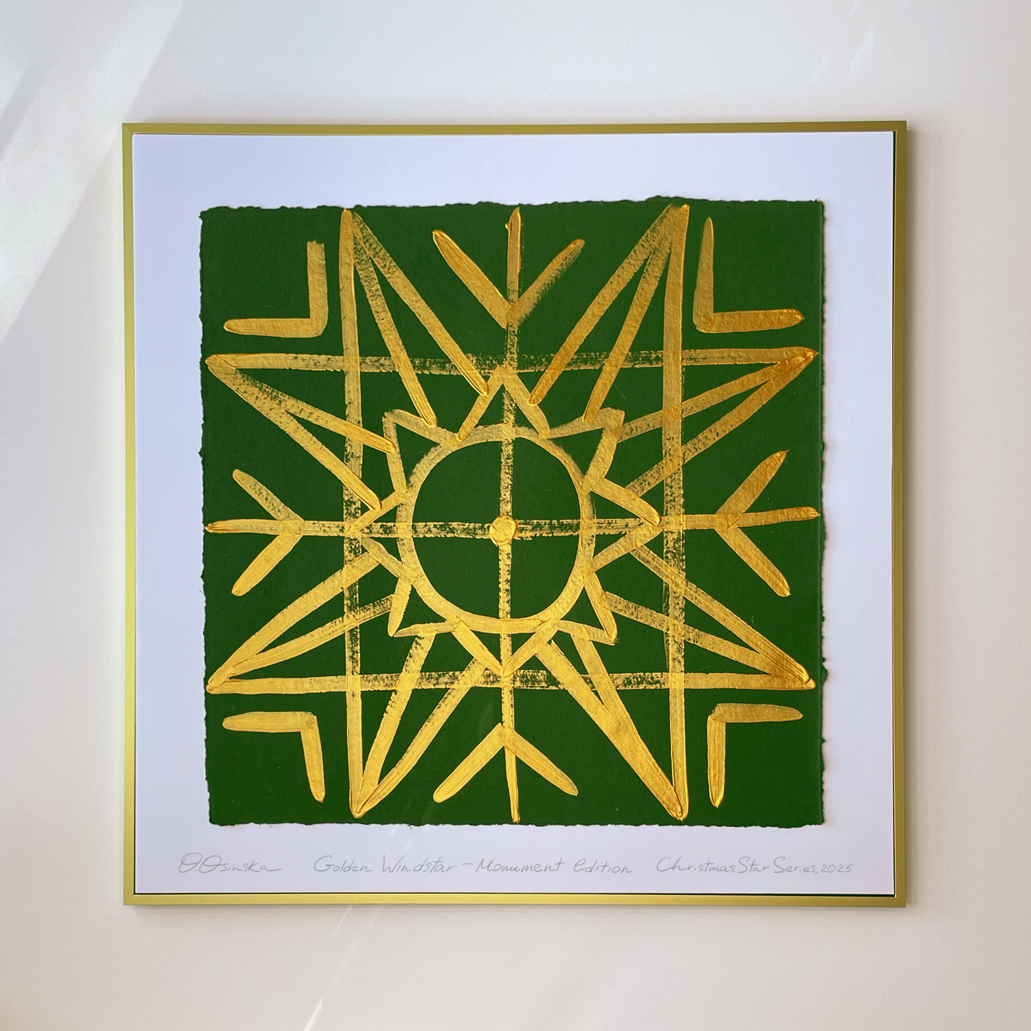 is a contemporary interpretation of the ancient Ukrainian Christmas Star symbol, painted in luminous gold on deep green handmade paper. Its intersecting geometric lines echo the protective energy and sacred rhythm found in traditional Ukrainian embroidery. This Monument Edition features an expanded, more powerful composition that emphasizes symmetry, structure, and visual weight—creating a striking, elevated presence in any modern interior. This artwork radiates balance, light, and festive strength—bringing a refined cultural statement into any living space.