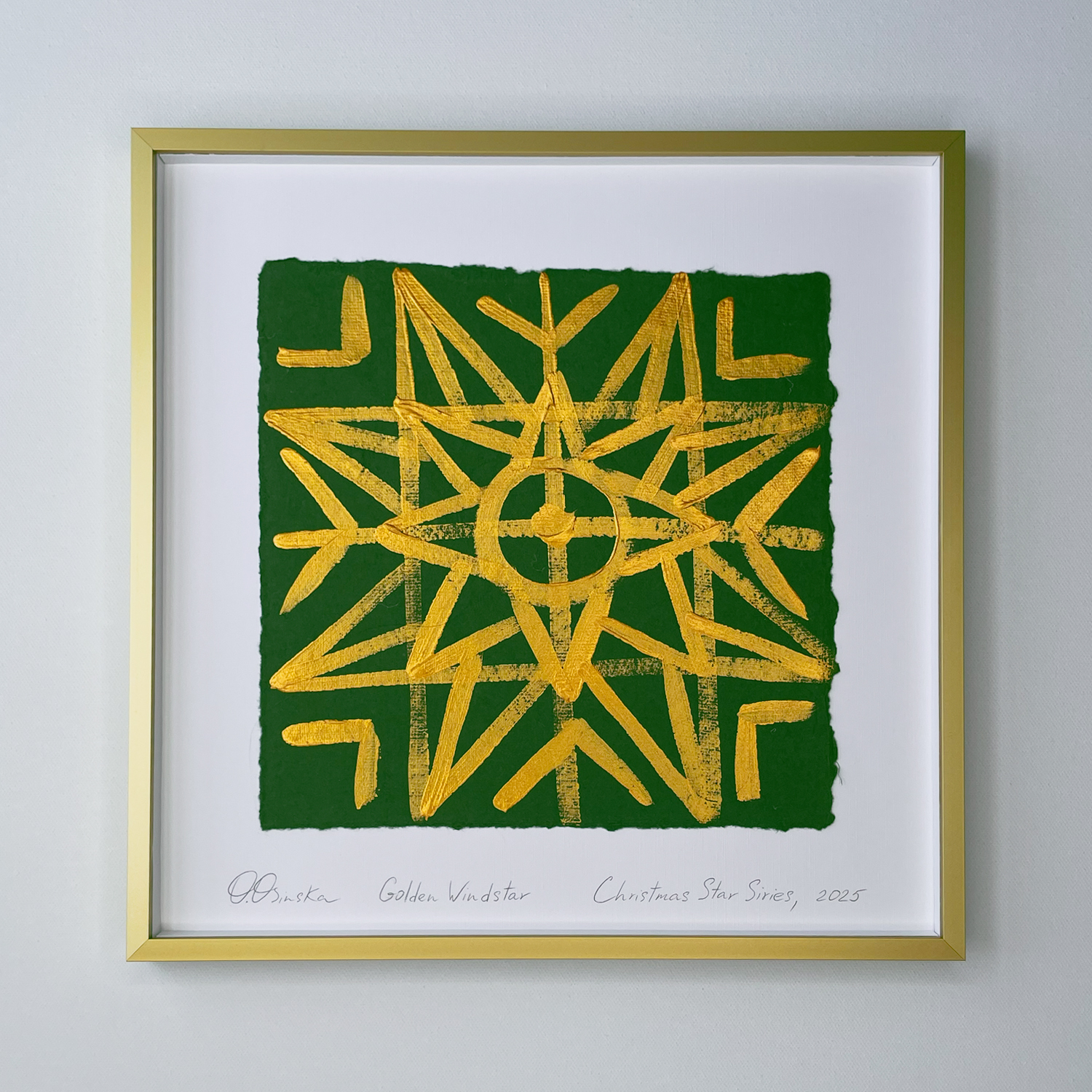 is a contemporary interpretation of the ancient Ukrainian Christmas Star symbol, painted in luminous gold on deep green handmade paper. Its intersecting geometric lines echo the protective energy and sacred rhythm found in traditional Ukrainian embroidery. This artwork radiates balance, light, and festive strength—bringing a refined cultural statement into any modern interior.