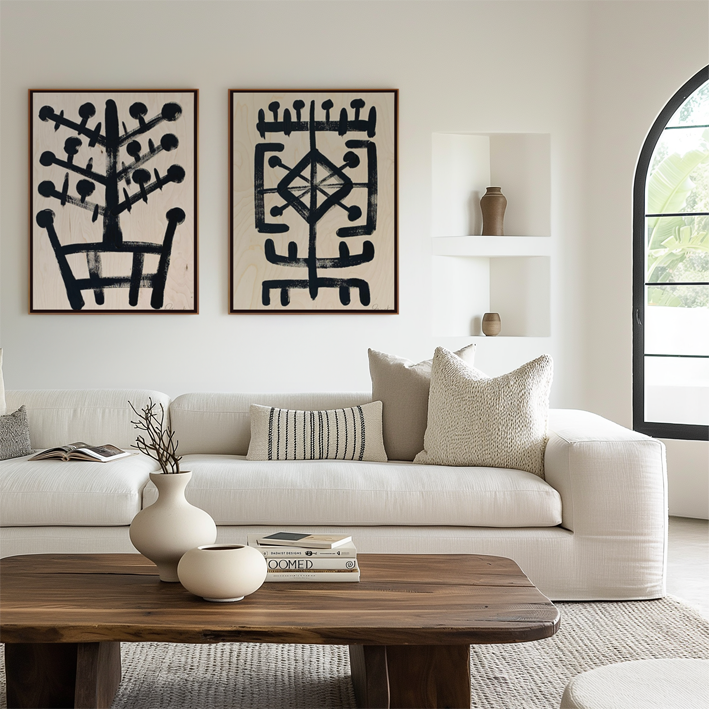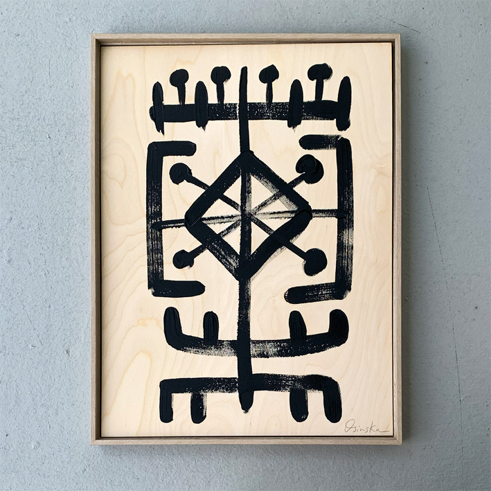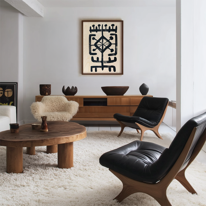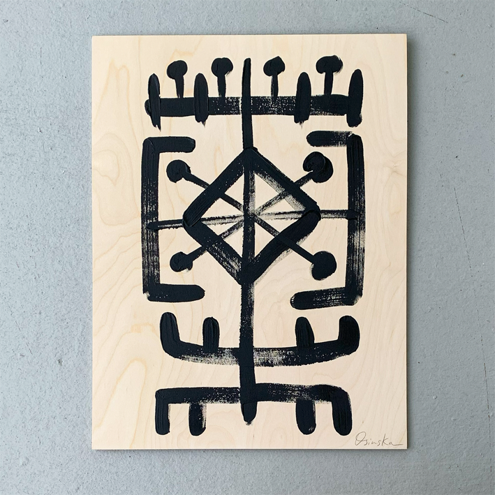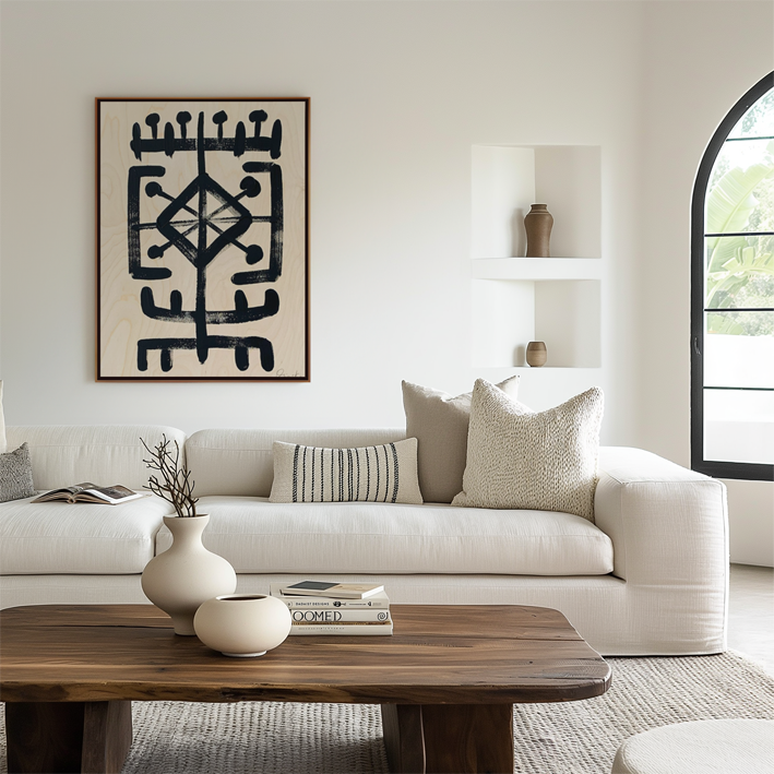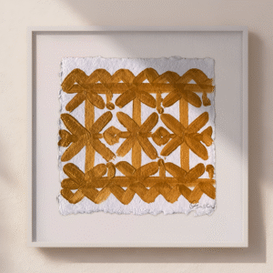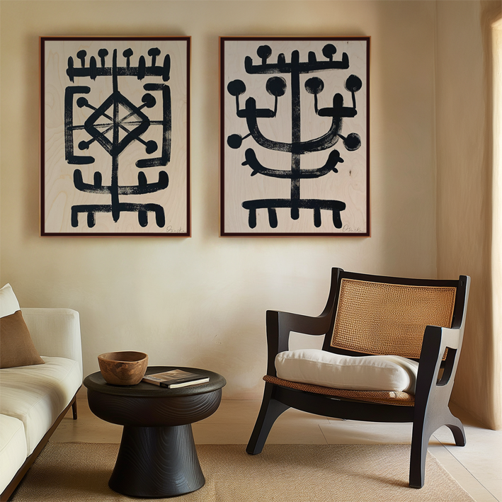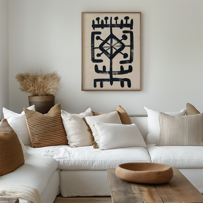 This piece presents a symbolic grid — an enclosed system of ancestral lines and energetic flow. At its center lies a diamond shape divided by radiating lines, evoking the seed of life and generational transmission. The surrounding forms emphasize sacred enclosure, with capped verticals and grounded anchors. The composition celebrates the structures that carry memory, the invisible order behind legacy, and the rhythm passed through generations.