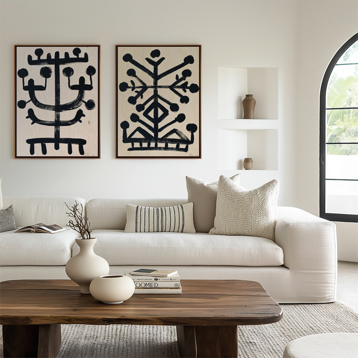 The symmetrical form, rising in stacked organic gestures, suggests spiritual elevation and generational continuity. Rounded terminals recall seeds, fruits, or watchers from the past — silent guardians of inherited wisdom. The raw texture and minimal palette invite a meditative, timeless presence.