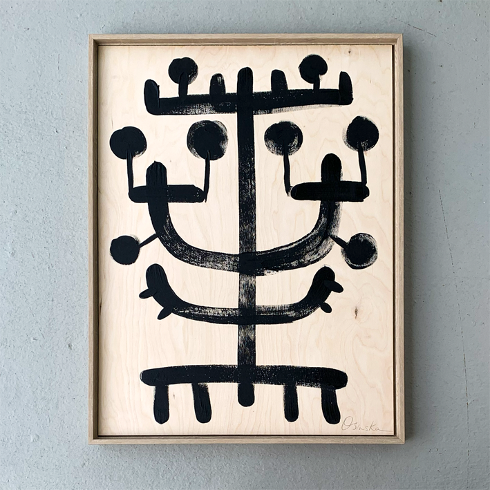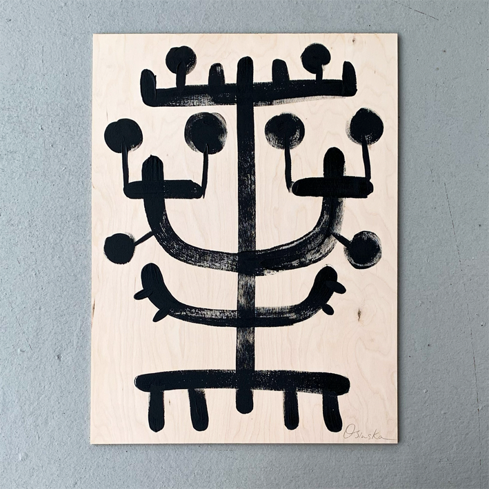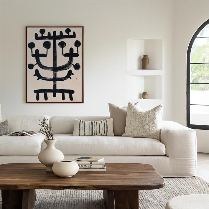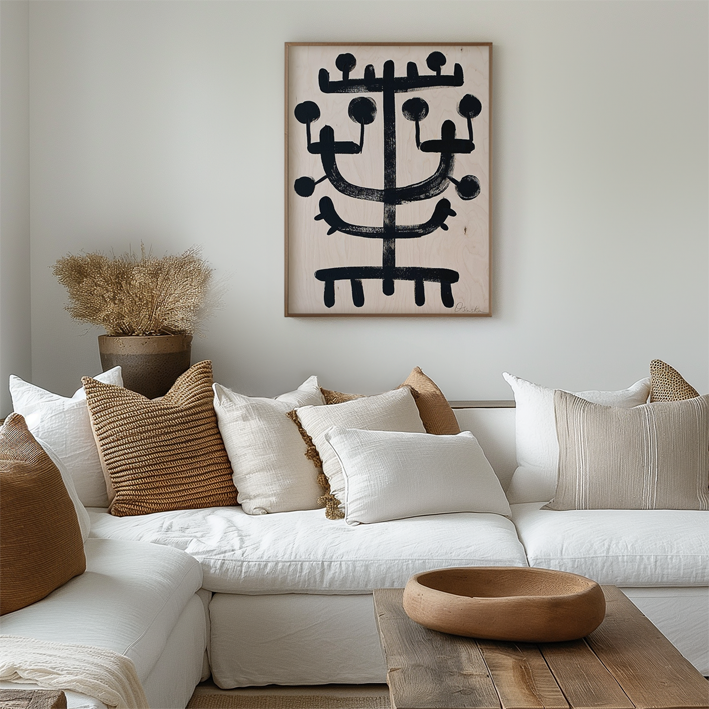 This striking composition is anchored by a powerful vertical axis with radiating horizontal branches, evoking the pulse of life flowing through an ancestral tree. The lower section resembles extended arms or roots reaching outward — symbolizing connection, grounding, and quiet strength.