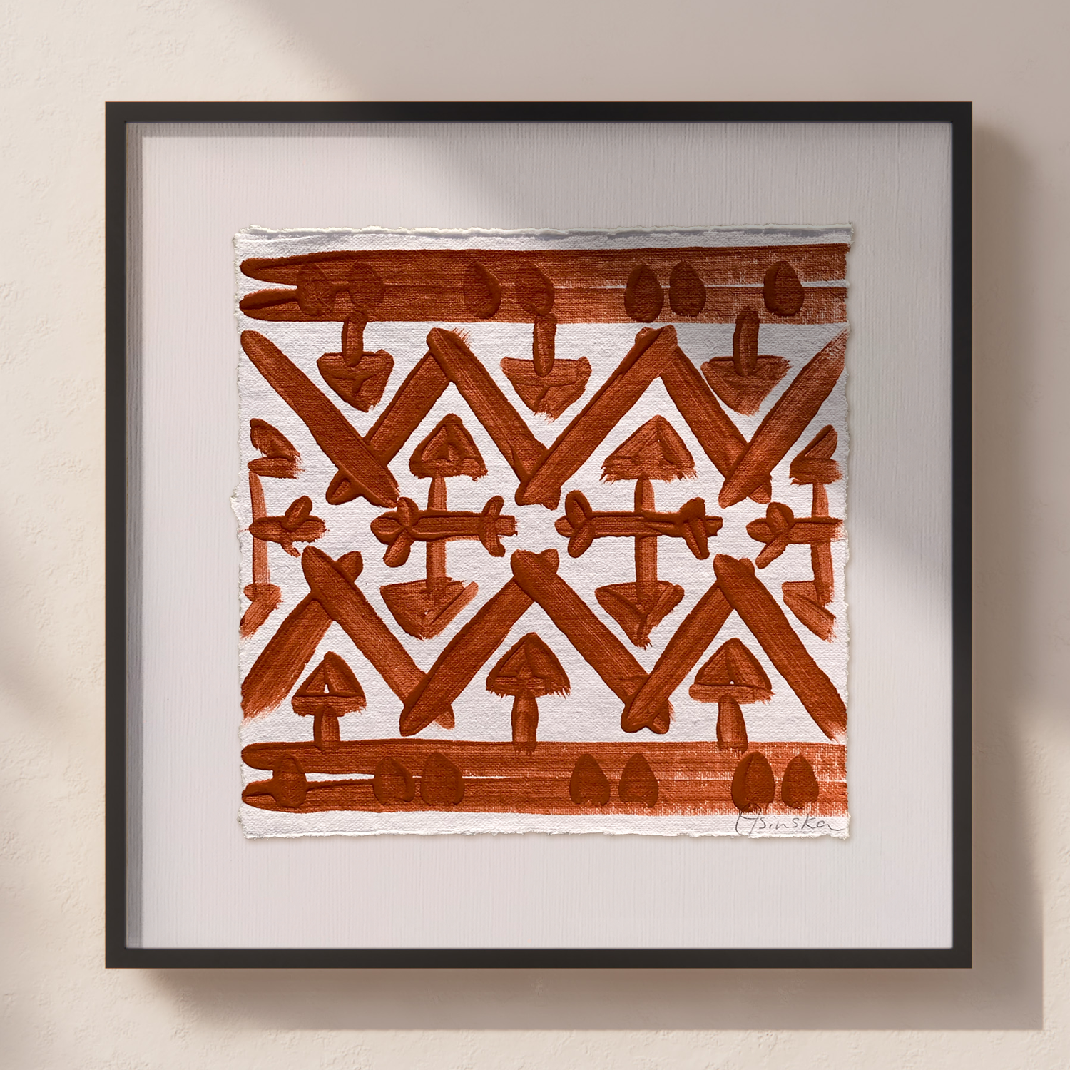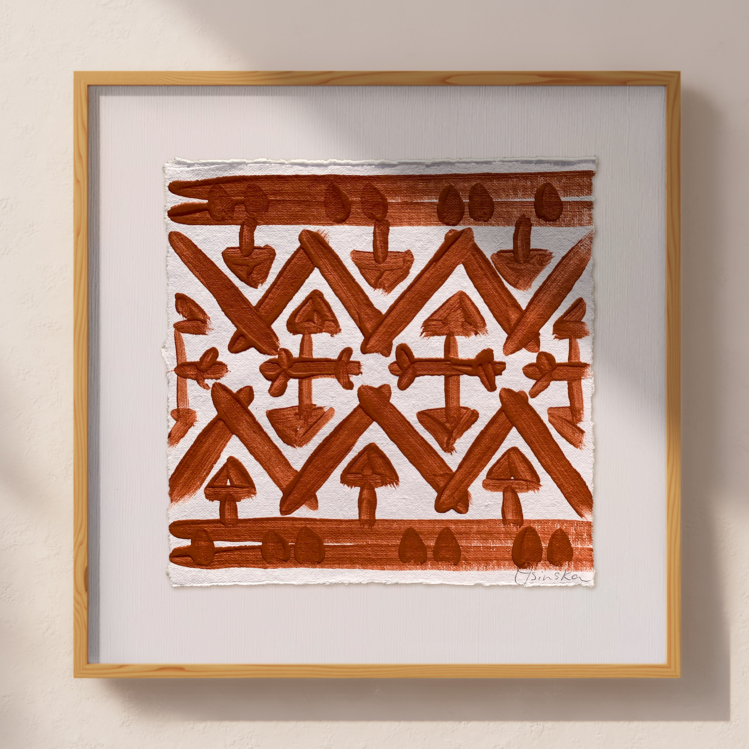 Arrows rise and intersect in a dynamic rhythm of terracotta tones. Inspired by ancient embroidery patterns, the composition embodies movement, growth, and ancestral protection. It’s a sacred pattern of direction — both grounded and reaching beyond.
