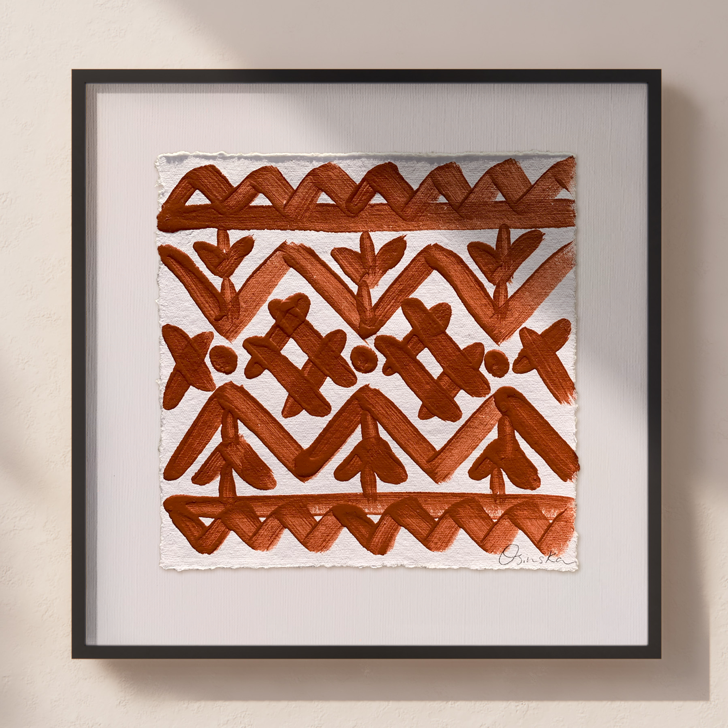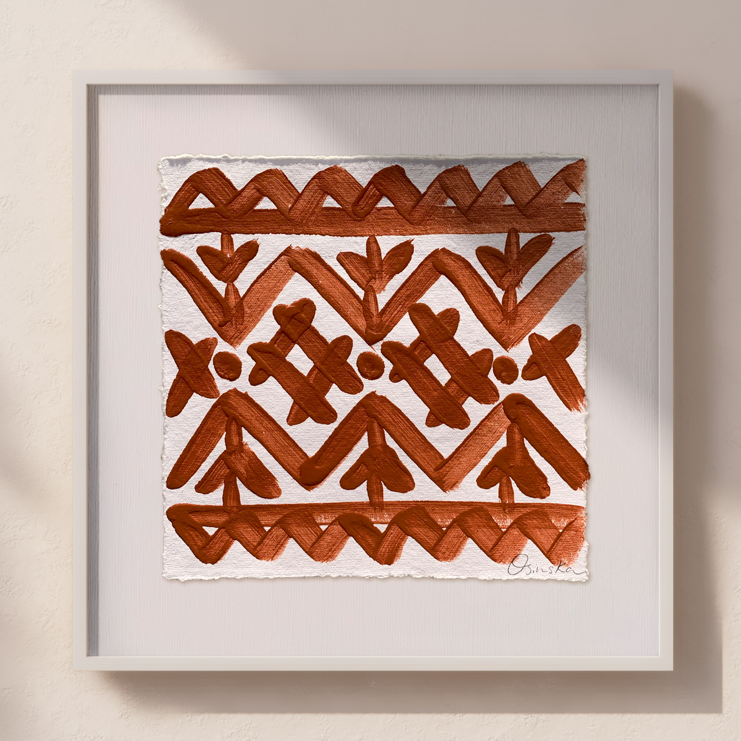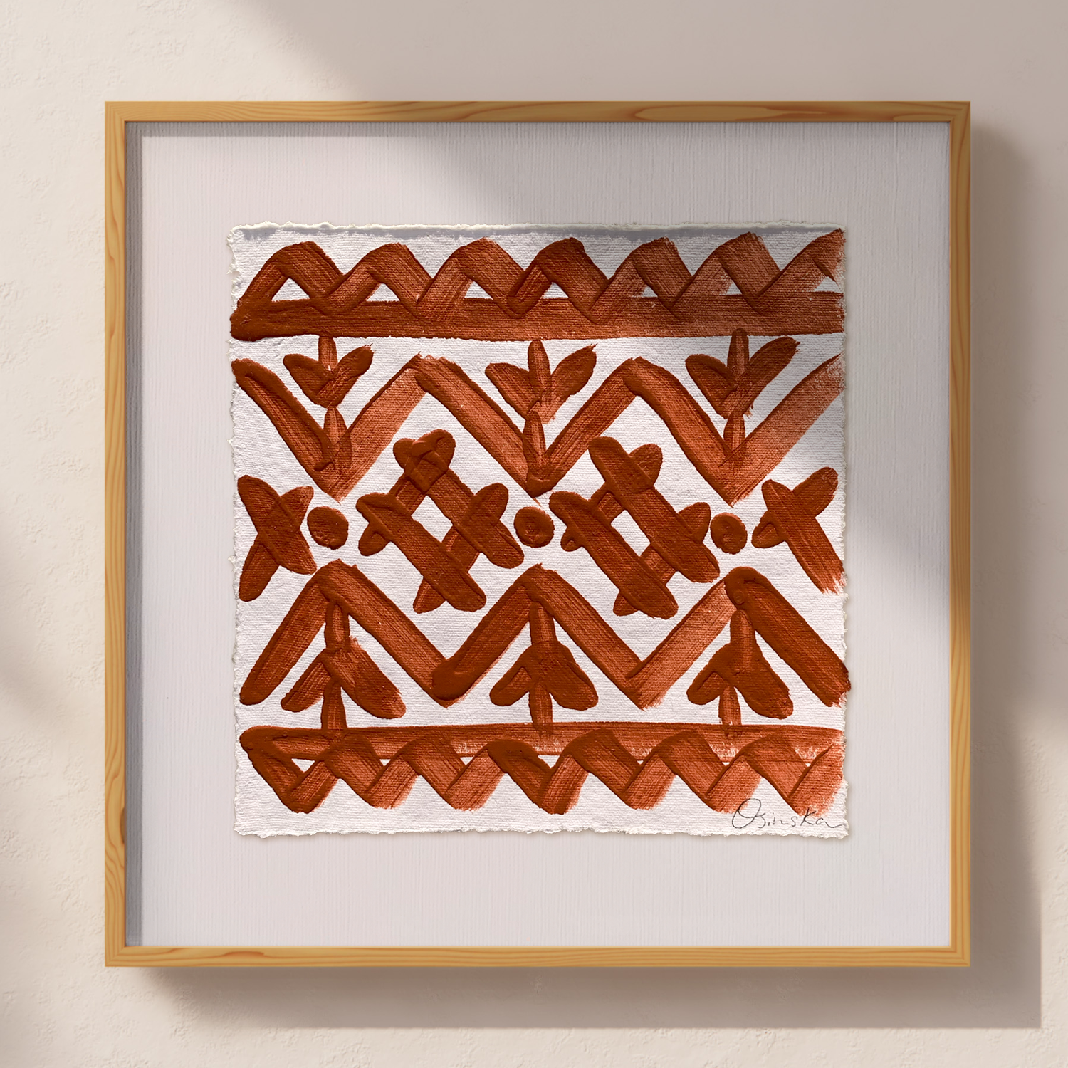 Terracotta lines rise and fall in waves of rhythm — like sowing rows, hills, and protective stitches. Inspired by Ukrainian embroidery, this piece holds a balance between growth and tradition, echoing the pulse of land and the wisdom of ritual.