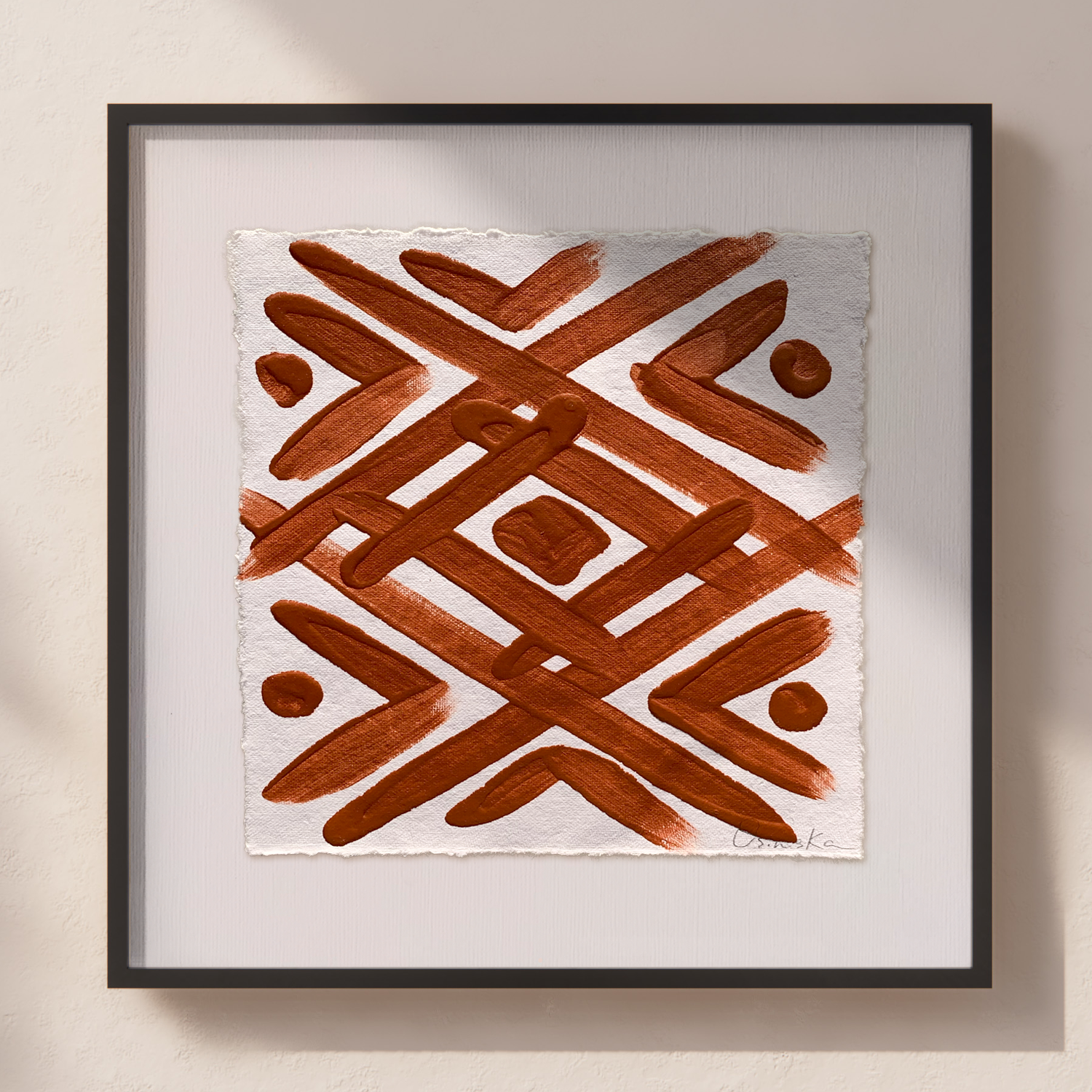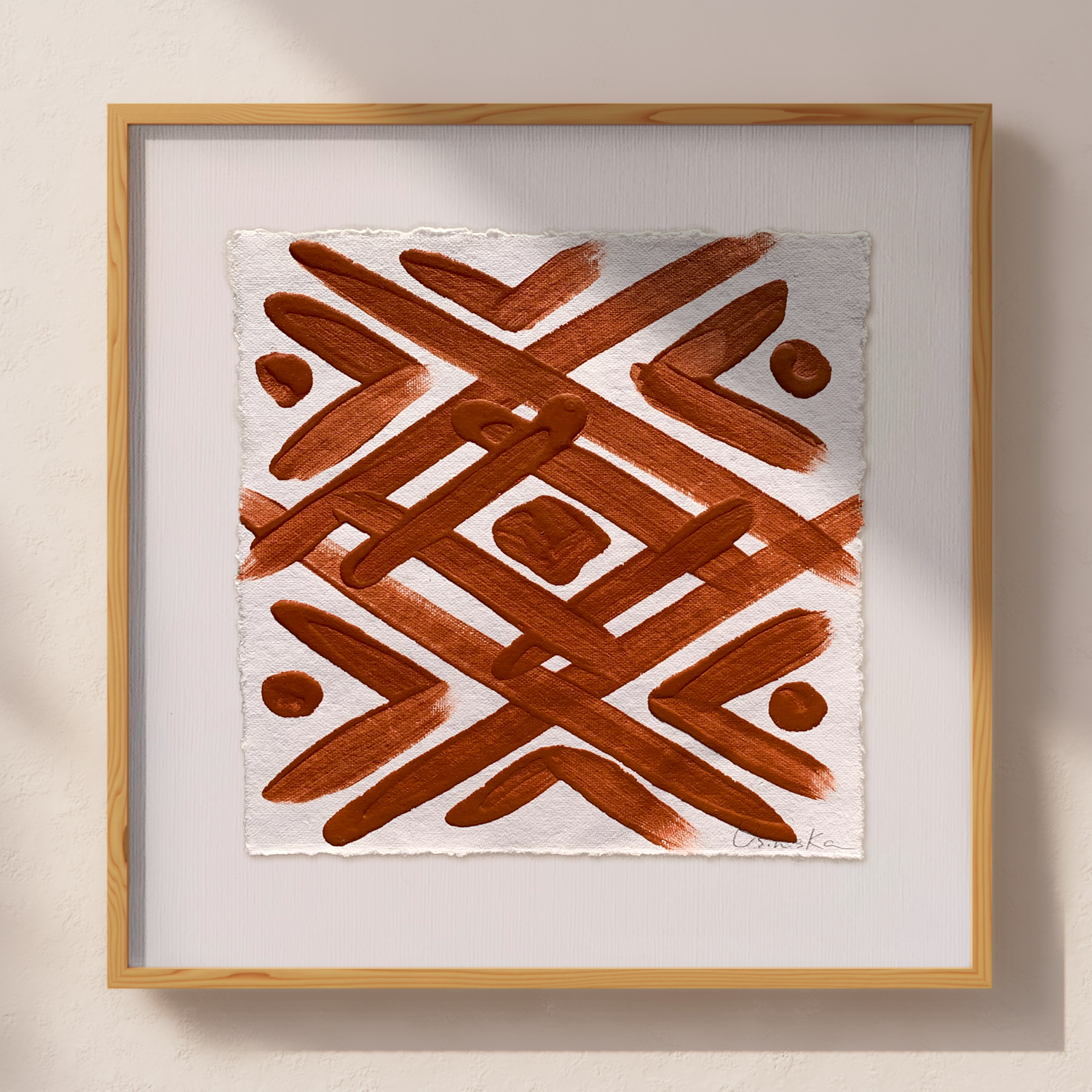 At the heart of this piece lies a sacred knot — woven from terracotta lines and surrounded by balancing dots. It speaks of unity, memory, and protection through pattern. A visual spell rooted in ancestral craft, closing the rhythm with quiet strength.