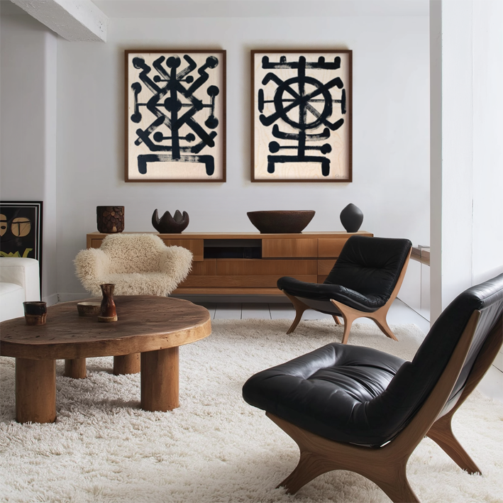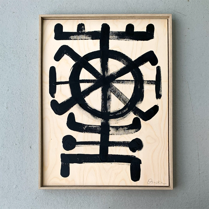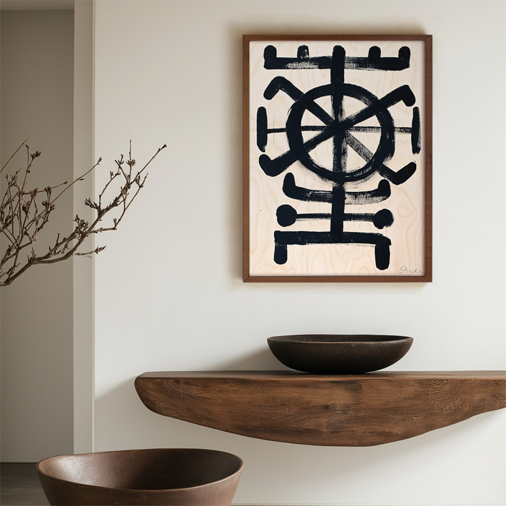 At the center lies a radiant wheel — a symbol of time, fate, and cyclical wisdom. Its radiating spokes evoke solar motifs and ancestral symbols of protection and eternity. The vertical axis anchors the form, linking upper and lower worlds — the earthly and the divine. Surrounding elements create a dynamic interplay of motion and stillness, expressing both journey and rooted identity.